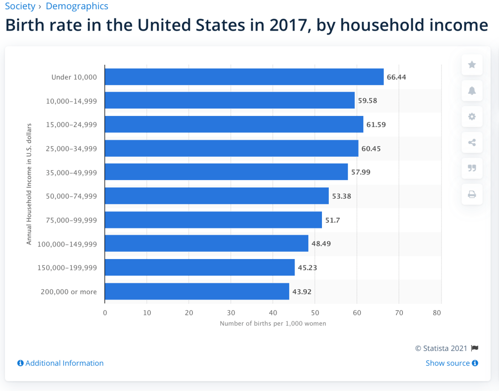 The above shows the relationship between birth rate and number of children. There is an inverse relationship between income and number of children. In short, those who are having the most children are those who can least afford children. A lot of this is likely because of birth control methods being more available as household income rises, but the trend is still disturbing.