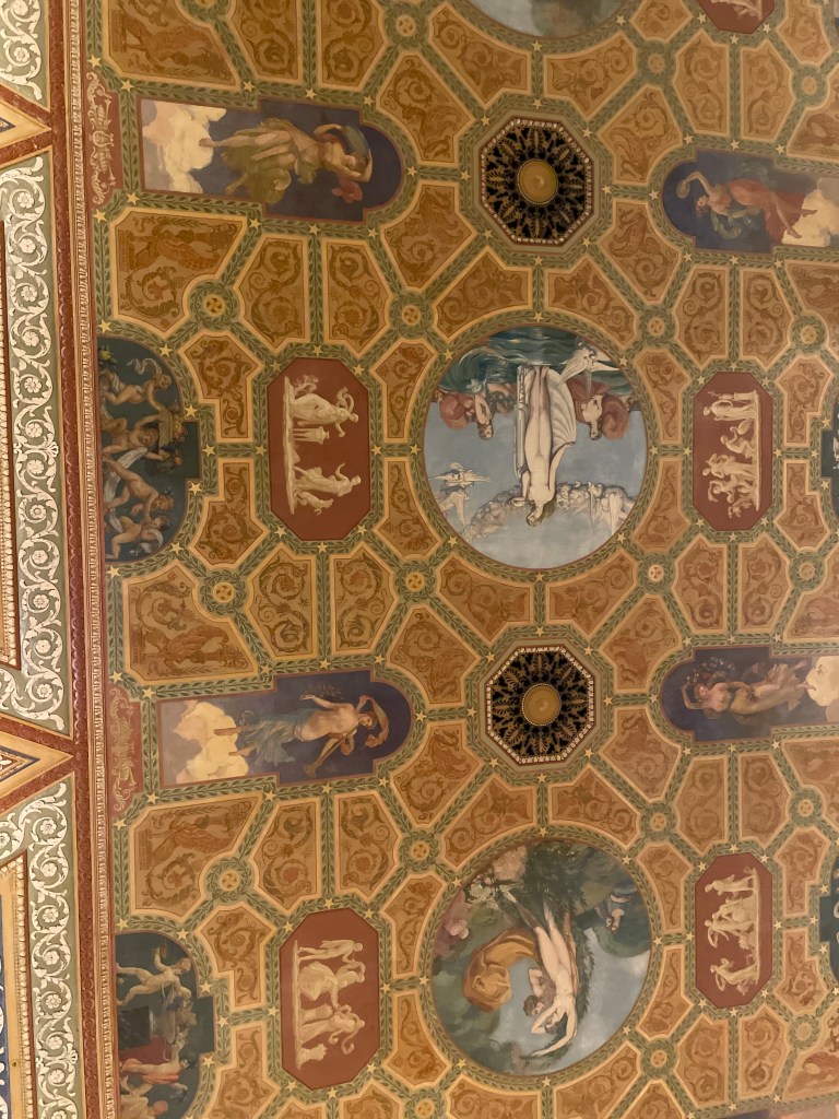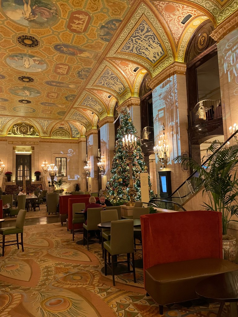 The hotel bar at the Palmer House was one of the main reasons I chose that hotel, having an ornate 1920’s era lobby, painted ceiling and everything. The hotel as a whole had issues, crappy wifi, and my room being next to the elevator bank, so I could hear everyone’s coming and goings at all hours, however, check out the lobby below.