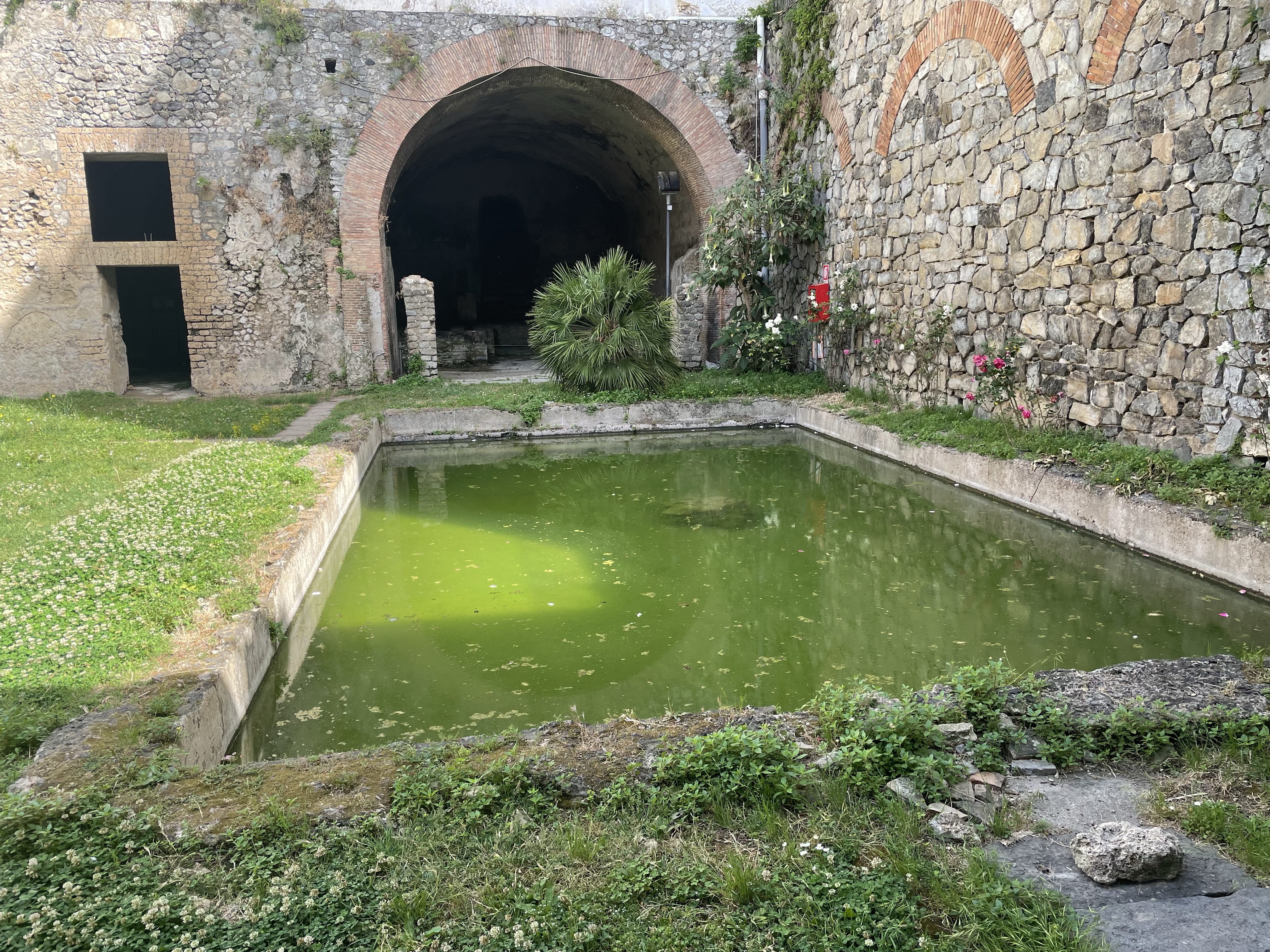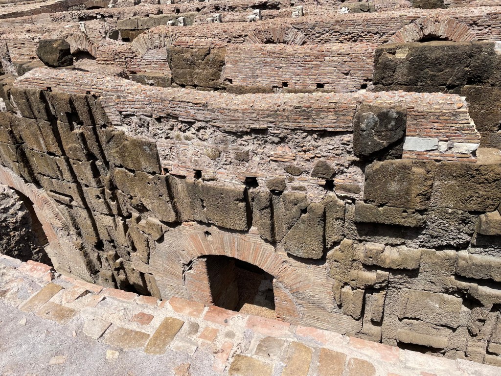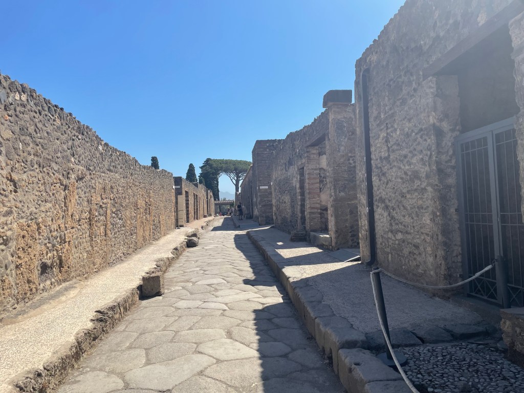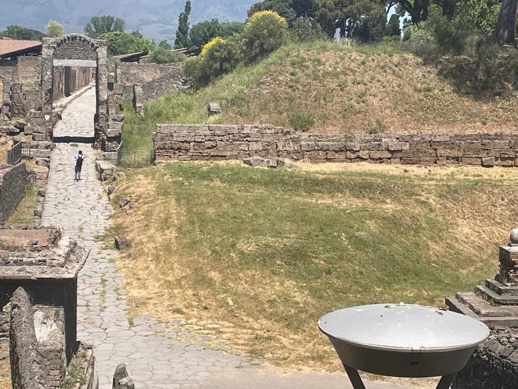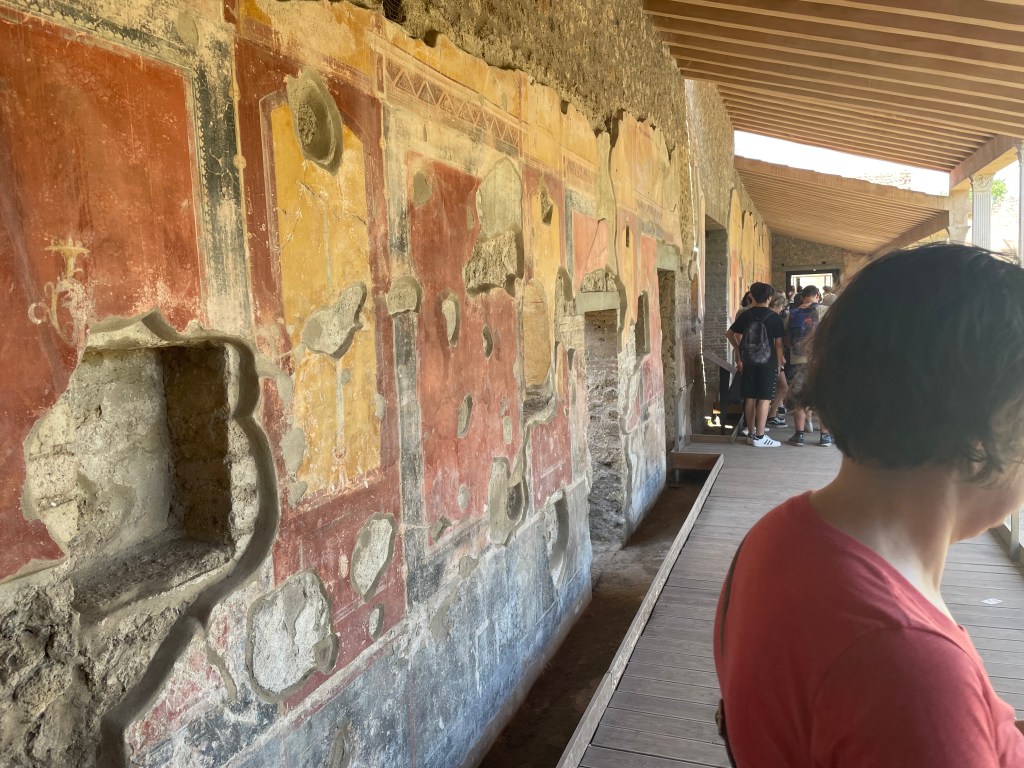 Today we took a road trip, via a tourist bus, to Pompei, the ancient Roman town that was buried by a volcano in 70 AD. Although I am familiar with the legend of Pompei since childhood, it doesn’t really impose just how large the town actually was, an how large the archeological site is. Also interesting is how well preserved some of the mosaic tile work and wall murals are that occupied peoples homes. After all, it’s not like there are a lot of homes today with murals on the walls. The reds and gold paints seemed to stick particularly well, though I don’t know if this is a product of those pigments and the things they are made of just sticking around better than other colors. Pompei also offers to opportunity to enter into a full on Colosseum style amphitheater, something the one in Rome does not, as the floor there had deteriorated centuries ago. Most of the buildings and homes were quite large, as Pompei was a pretty well of city in the Roman Empire, with many of the Emperors, Senators, and whatnots making their vacation homes here.